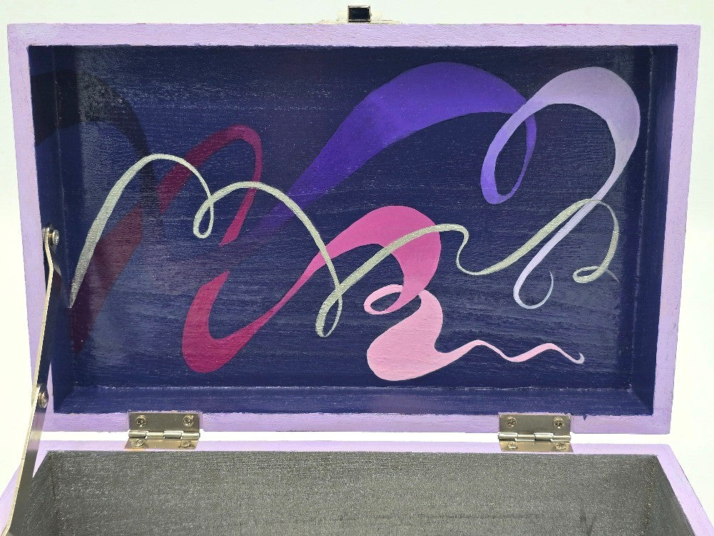 - Interior Colors: Silver box; lid design in navy, purple, pink, and silver.